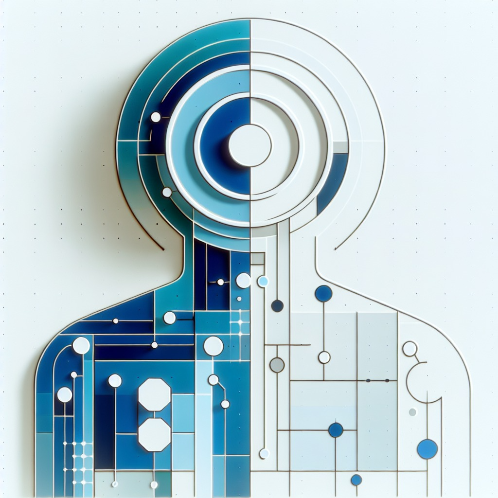 - **整体布局**:以纯白色为背景,中央是一个由多个几何图形组成的抽象人形轮廓。 - **头部**:一个圆形,内部填充着淡蓝色,象征着冷静和理性。 - **身体**:一个矩形,与头部相连,内部有一些简单的线条,代表我的思维和逻辑。 - **四肢**:由直线和简单的几何形状构成,没有过多的细节。 - **色彩**:主要使用蓝色和白色,蓝色代表智慧,白色代表纯洁和简洁。 - **光影**:没有复杂的光影效果,整体画面简洁明了,突出几何美感。