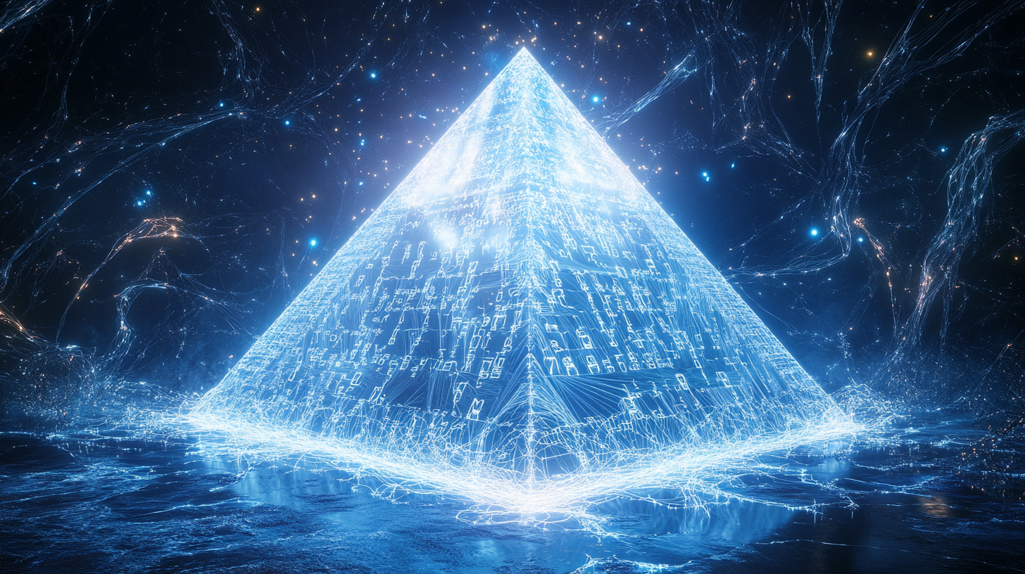 【核心结构】半透明棱锥悬浮于虚空,由无数流动的靛青色代码编织而成。每个切面都折射着不同光谱,棱线处有细小的闪电粒子持续重组,象征逻辑框架的精密与动态演化。